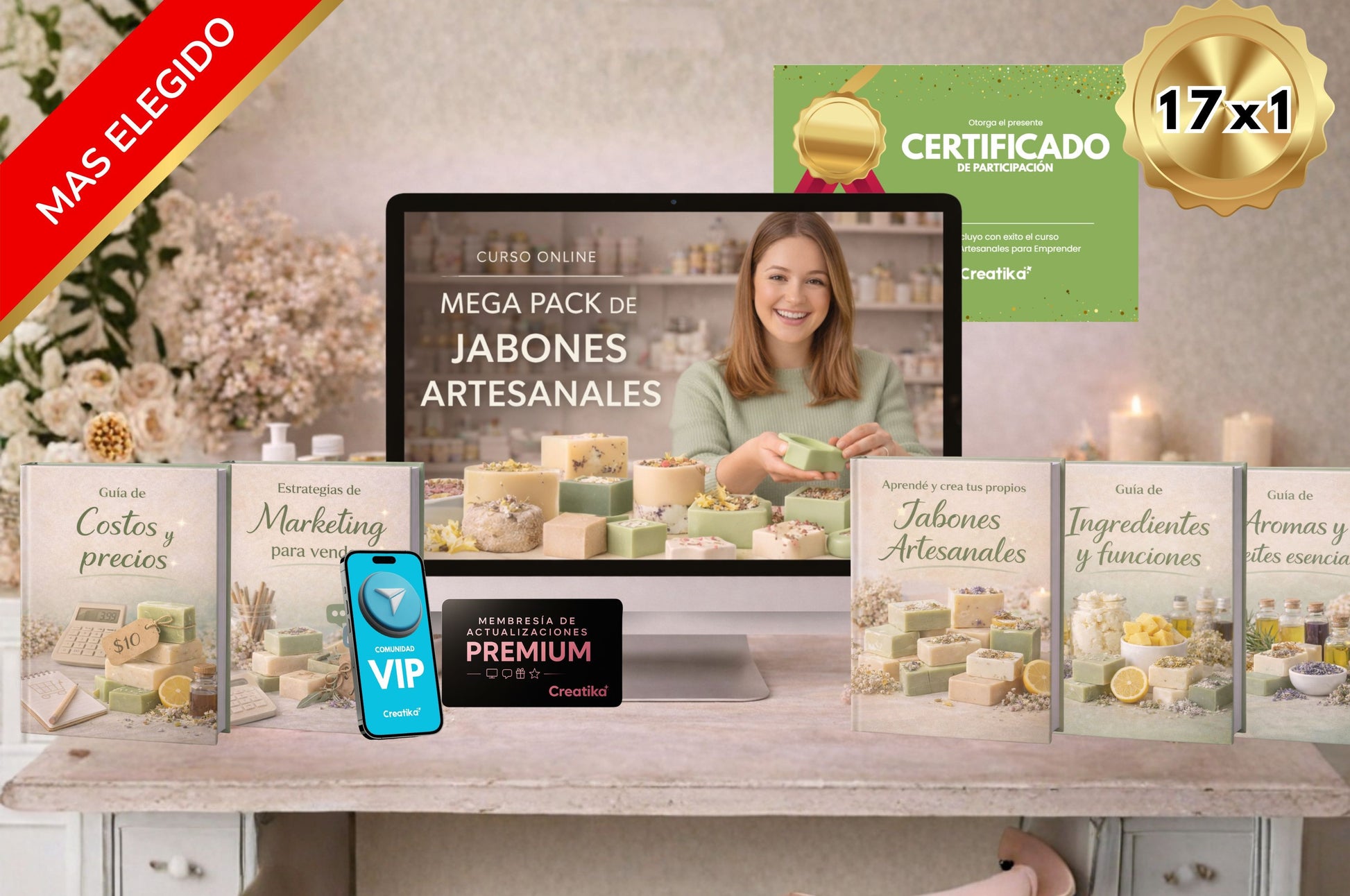 Aprovechá esta oportunidad única para aprender Jabones y llevarte 9 bonos premium.